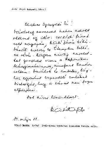 Kedves Igazgató Úr ! Vásárhely nemcsak nekem adott otthont egy időre: családi fészek volt nagyapám, Szabó János békés-bánáti esperes, az Ótemplom lelkésze révén. Magam mindig szeretettel gondolok vissza a Református Leánygimnáziumra, amelynek tanára voltam: barátok és emberhez, tájhoz egyaránt kapcsolódó emlékek biztosítják, hogy a várost nem fogom elfelejteni. Sok szíves köszöntéssel: Szabó Magda 81. május 11. |